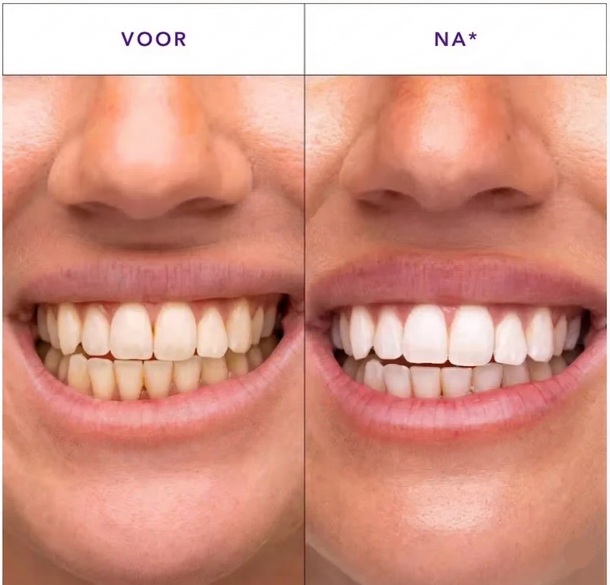 Onze paarse kleurcorrigerende technologie neutraliseert gele tinten direct bij contact. Ervaar een zichtbaar witter resultaat, zodra u de strips verwijdert.